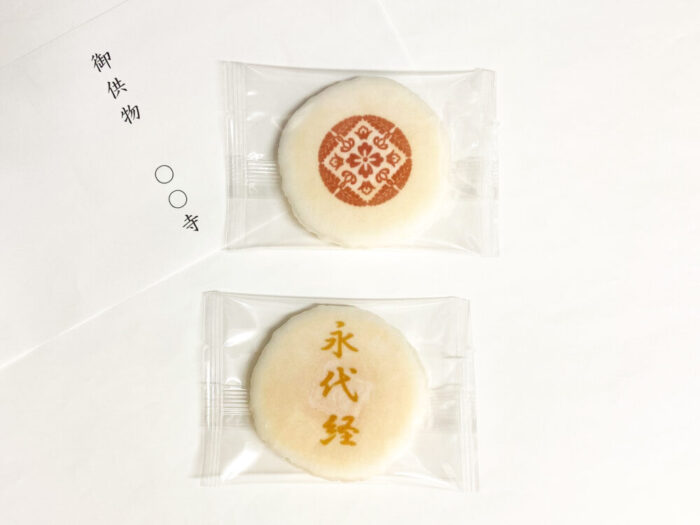 節分が終わり紀元祭や天長祭がお宮様で引き続き行われていますが3月にはひなまつりがあります。そして3月下旬には春のお彼岸となります。浄土真宗様では永代経法要も行われますが、法要名入りのお煎餅のお問い合わせをいただきましたのでご案内申し上げます。麩焼き煎餅2枚箱入りで、1枚に宗紋、1枚に「永代経」と文字が入ります。写真は真宗大谷派様の八藤紋入りですが、他の浄土真宗様のご紋入りの対応も承っております。お気軽にお問合せください。どうぞよろしくお願い致します。
